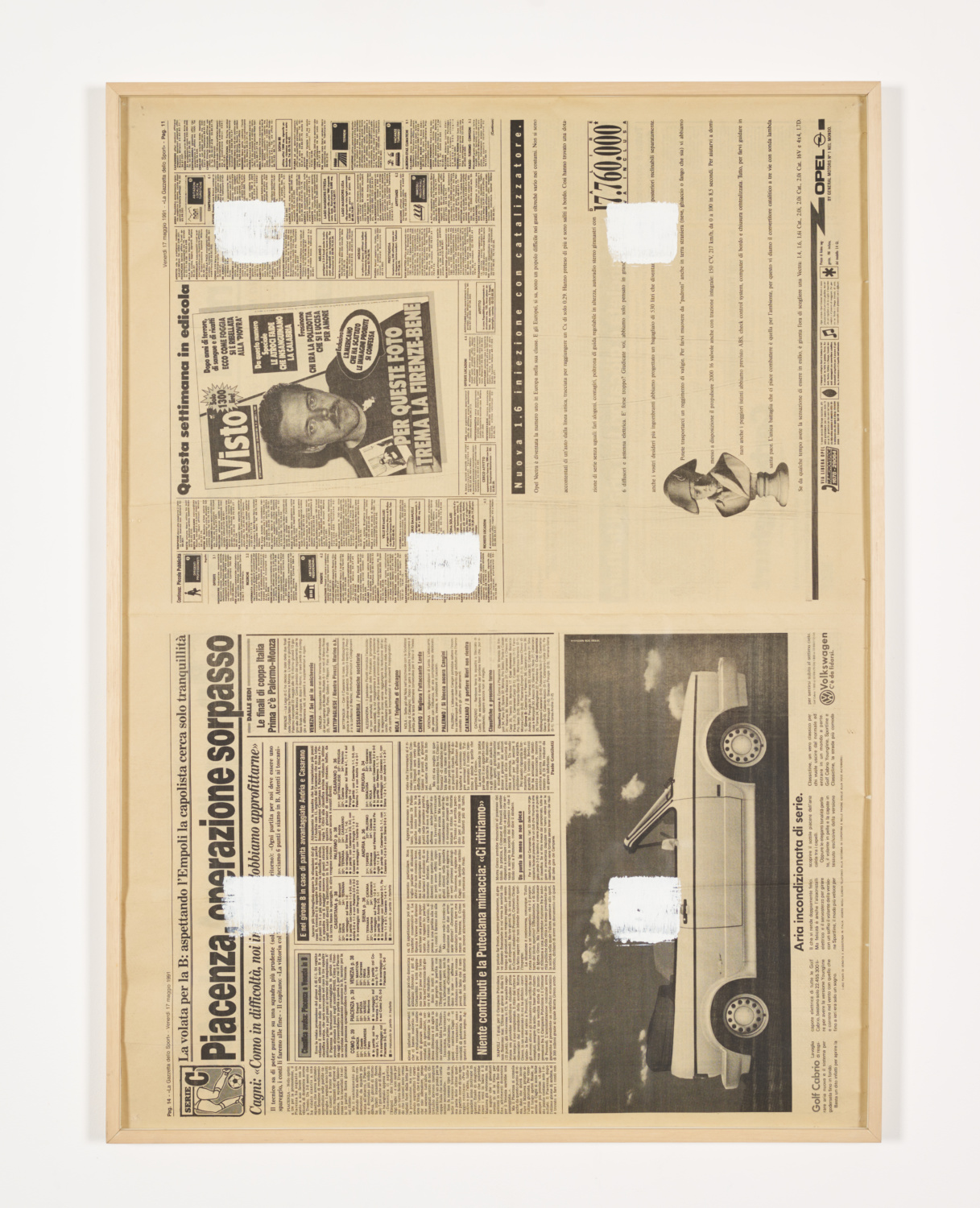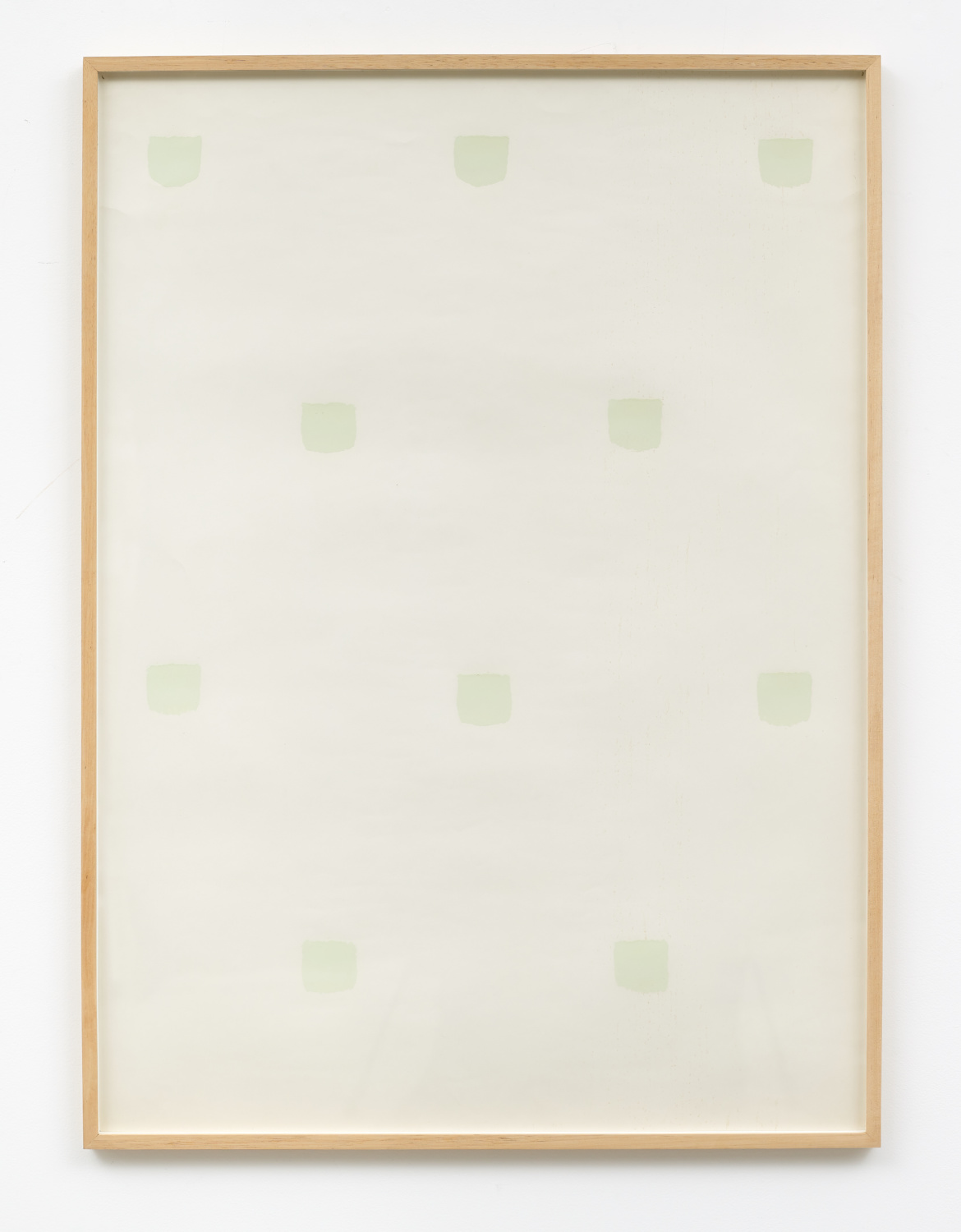 Niele Toroni pioneered a practice called “Travail-Peinture” which entails marking a surface with imprints of a no. 50 paintbrush at regular 30 cm intervals. Executed on diverse surfaces such as canvas, newspaper, cloth, gallery walls, and floors, Toroni’s works are both paintings and painterly interventions into space. Each marking is distinct and yet all the markings are the same, transforming the experience of spaces and creating a field in which formal tensions between uniformity and difference, repetition and spontaneity emerge.