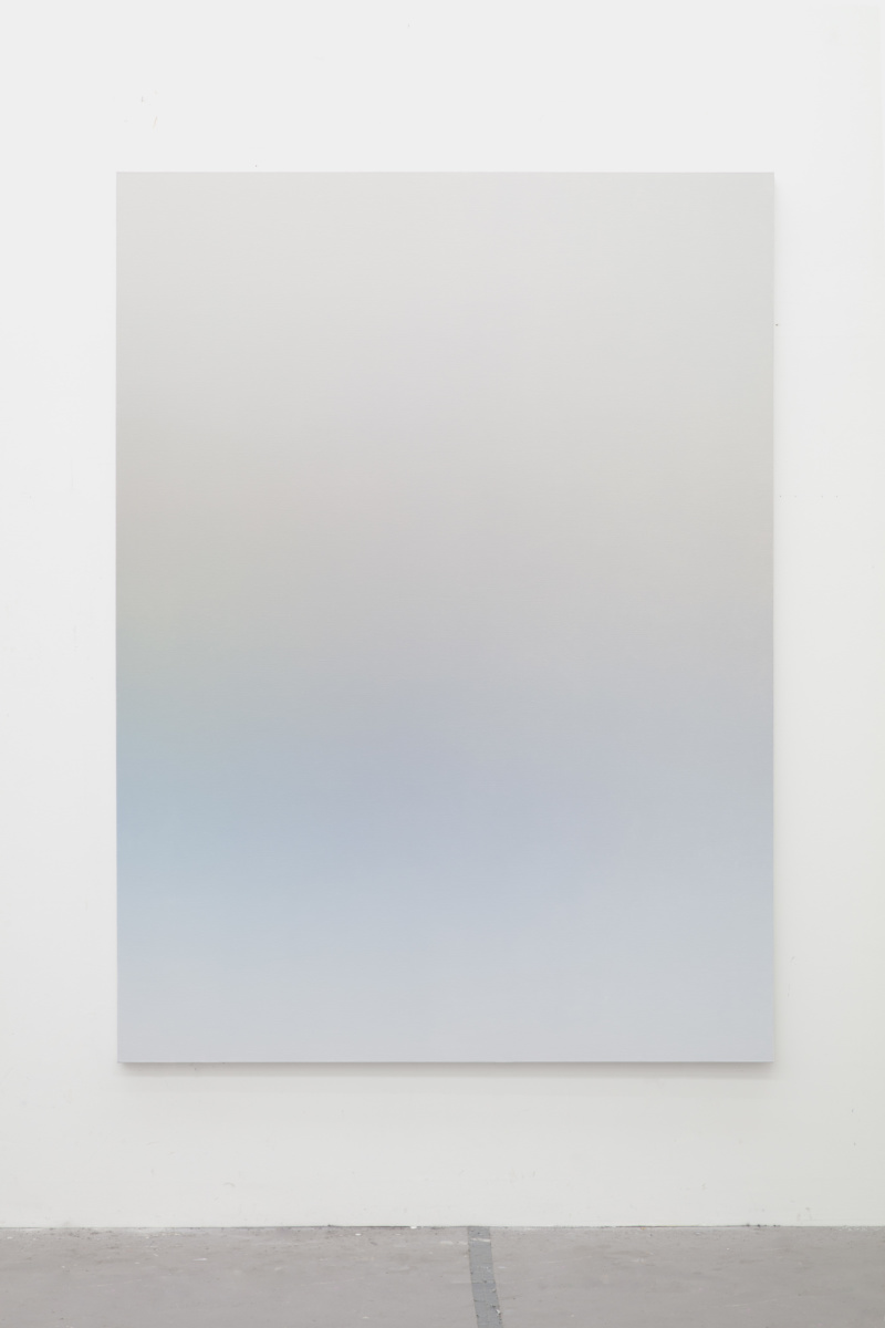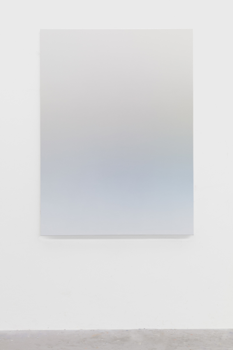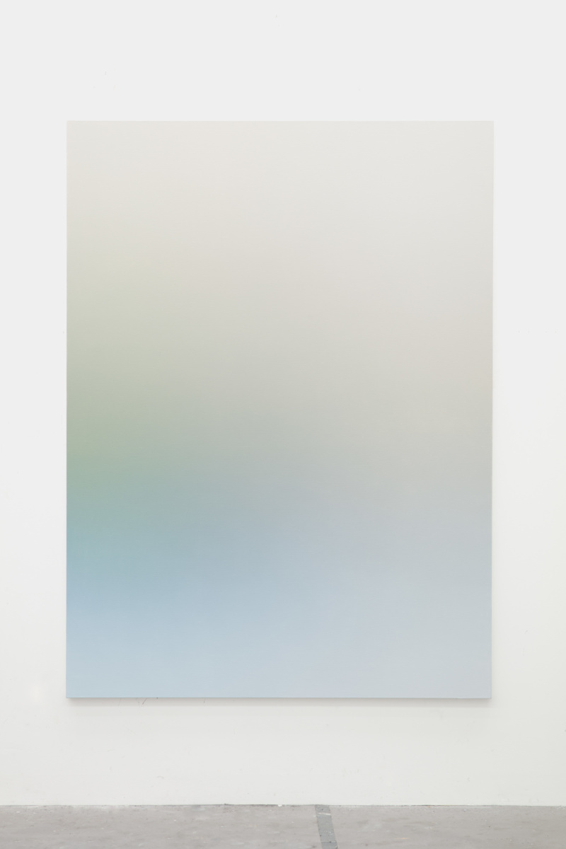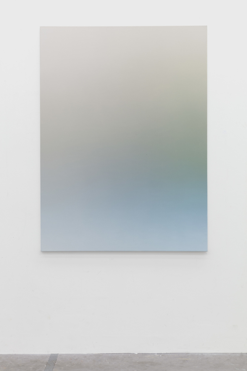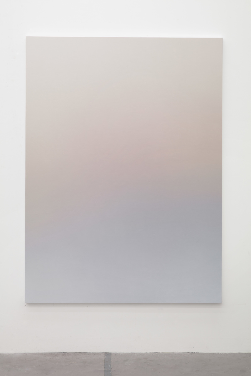 This abstract language is activated in Vermeersch’s color gradients. These paintings are the result of a meticulous process whereby the artist becomes a kind of human printer—blending paint into smooth and seamless surfaces that conceal the labor involved in making them. These seemingly straightforward paintings and the illusory space they conjure aim to register a presence while also allowing that presence to expand through representation and test the limits of what can constitute an image. Here, a painting technique that requires control and mastery is put to use for the translation of poor technical images—accidental photographs or images without spatial referents, photographs of undefined shadows, clear skies or architectural details. In the process of filtering these already abstract photographic sources, painting liberates itself from any referent to invent a formless representation that enables a purely physical and perceptual experience. This physical experience, which requires the presence of the body in space entails a slow way of looking that counters the fast consumption of images that prevails in our day to day.