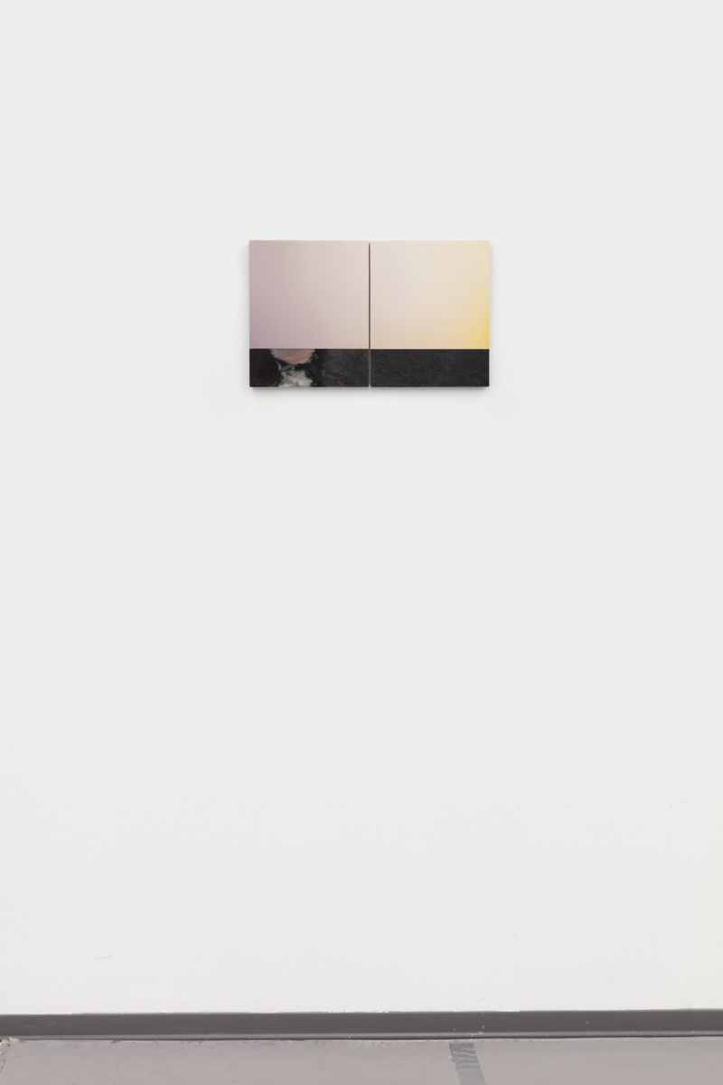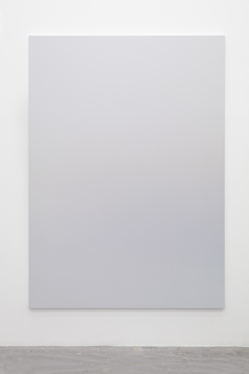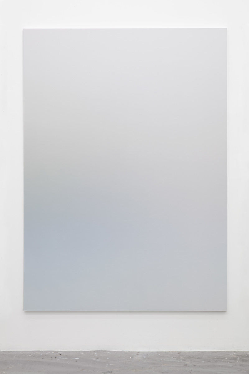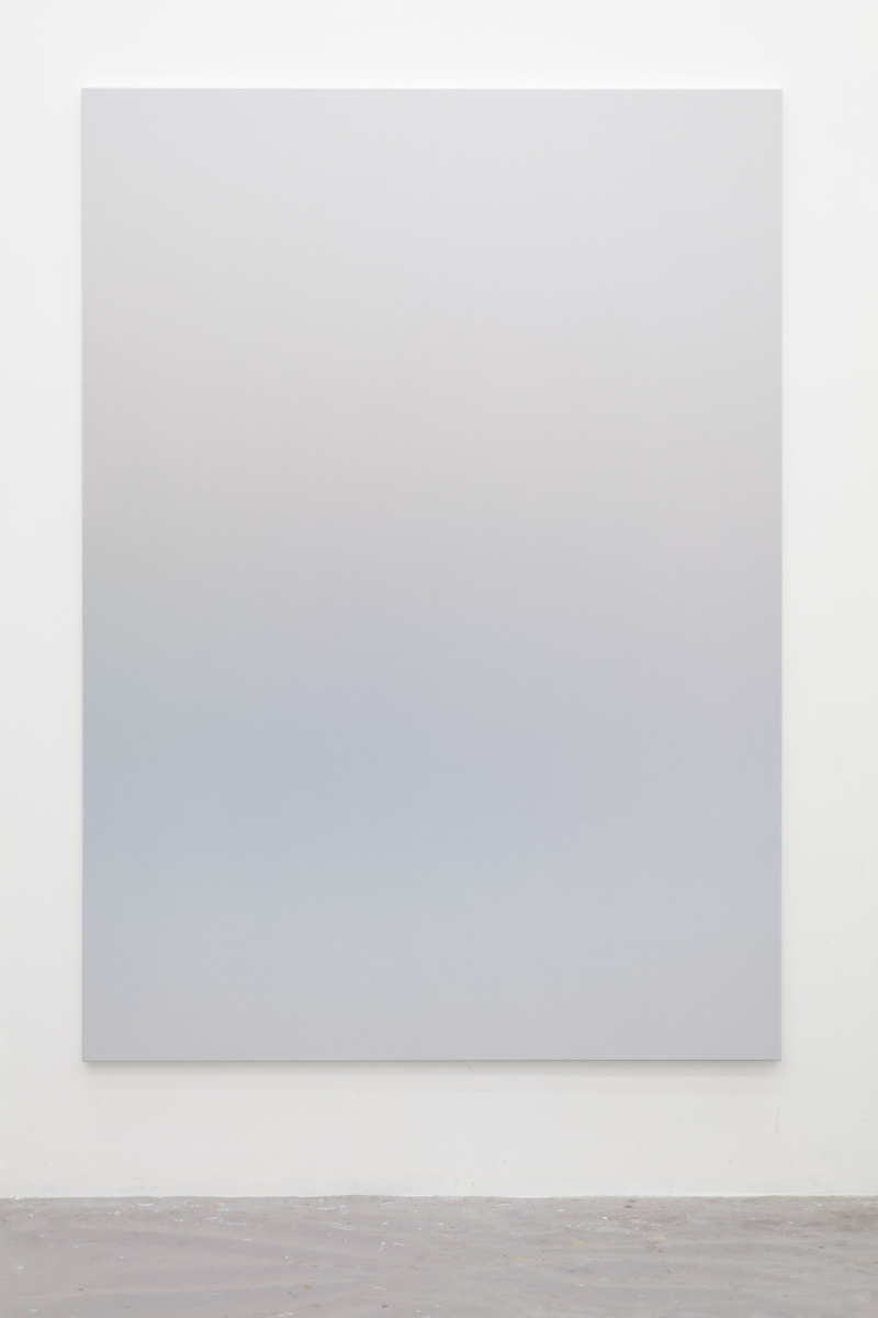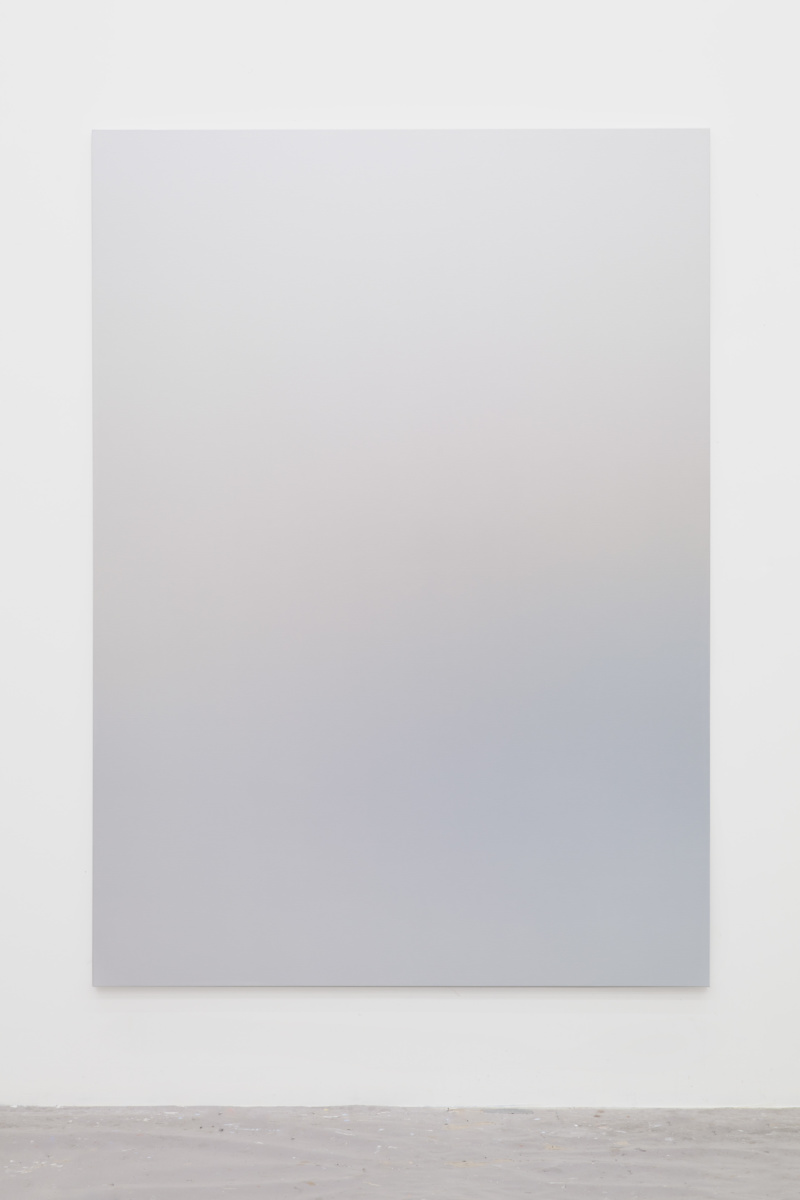 This abstract language is activated in Vermeersch’s color gradients. These paintings are the result of a meticulous process whereby the artist becomes a kind of human printer—blending paint into smooth and seamless surfaces that conceal the labor involved in making them. These seemingly straightforward paintings and the illusory space they conjure aim to register a presence while also allowing that presence to expand through representation and test the limits of what can constitute an image. Here, a painting technique that requires control and mastery is put to use for the translation of poor technical images—accidental photographs or images without spatial referents, photographs of undefined shadows, clear skies or architectural details. In the process of filtering these already abstract photographic sources, painting liberates itself from any referent to invent a formless representation that enables a purely physical and perceptual experience. This physical experience, which requires the presence of the body in space entails a slow way of looking that counters the fast consumption of images that prevails in our day to day.